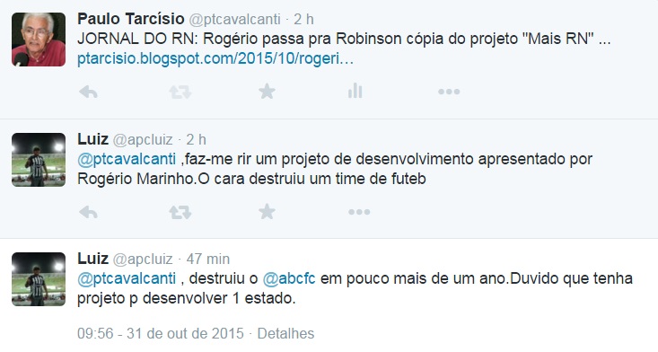 Tão logo postei no twitter chamada para a matéria sobre o projeto "Mais RN", que o deputado Rogério marinho entregou, como sugestão, ao governador Robinson Faria, o leitor "luiz @apcluiz", servidor público estadual, professor de Física (licenciado pela UFRN) e torcedor do ABC reagiu de forma cética e se justificou nas ruas postagens que reproduzo abaixo: